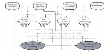 The West Coast Transient (WCT) population of Bigg’s Killer Whales (BKW) was listed as Threatened under the Species at Risk Act in 2003 and is vulnerable to the cumulative effects of human threats. The current understanding of threats (reduced prey availability, acoustic and physical disturbance, and contaminants), threat interactions, and potential impacts to fecundity and mortality were summarized in a Pathways of Effects (PoE) model that includes 16 pathway linkages from threats and threat interactions to effects on WCT fecundity and mortality. Sufficient knowledge and data were available to quantify eight of the pathway linkages in the PoE model and include them in a population viability analysis (PVA) model.